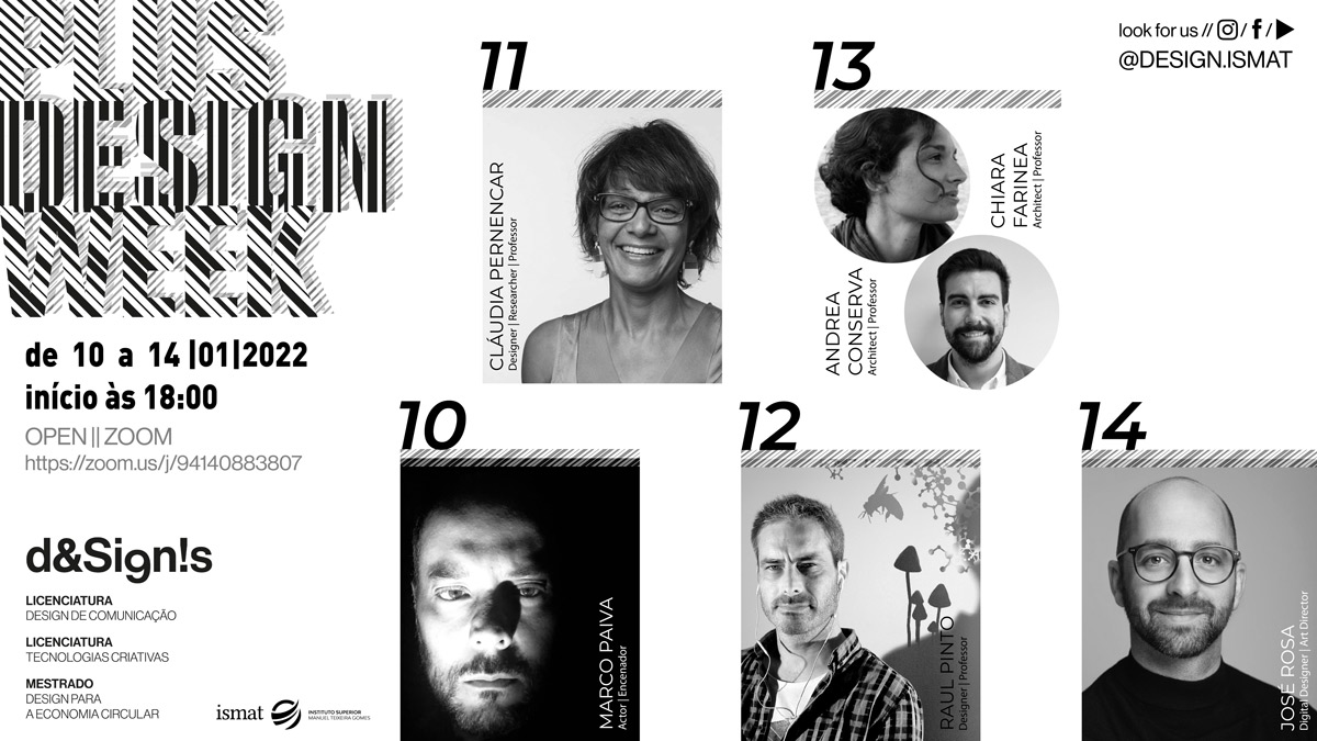 “PLUS DESIGN WEEK é uma semana intensiva de formação, que se realiza entre dia 10 e dia 14 de Janeiro de 2022, para todos os estudantes da Licenciatura de Design de Comunicação, Licenciatura de Tecnologias Criativas, Mestrado em Design para Economia Circular e publico em geral.