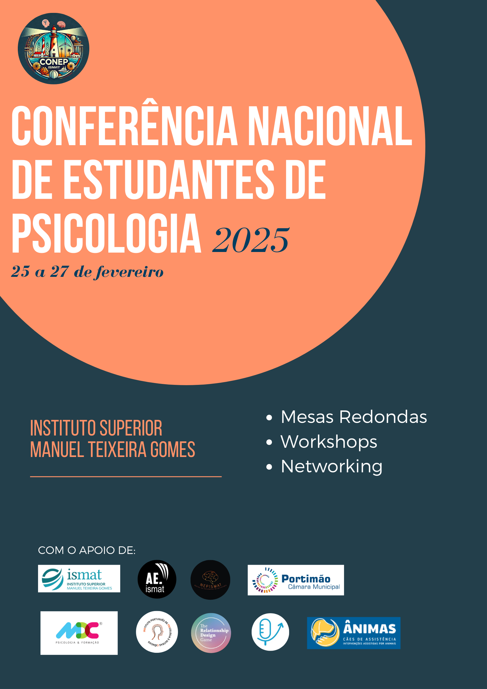 Este evento, criado por e para estudantes de Psicologia de todo o país, será uma oportunidade única de aprendizagem e troca de experiências! Acontecerá nos dias 25, 26 e 27 de fevereiro de 2025, em Portimão, no ISMAT – Instituto Superior Manuel Teixeira Gomes.