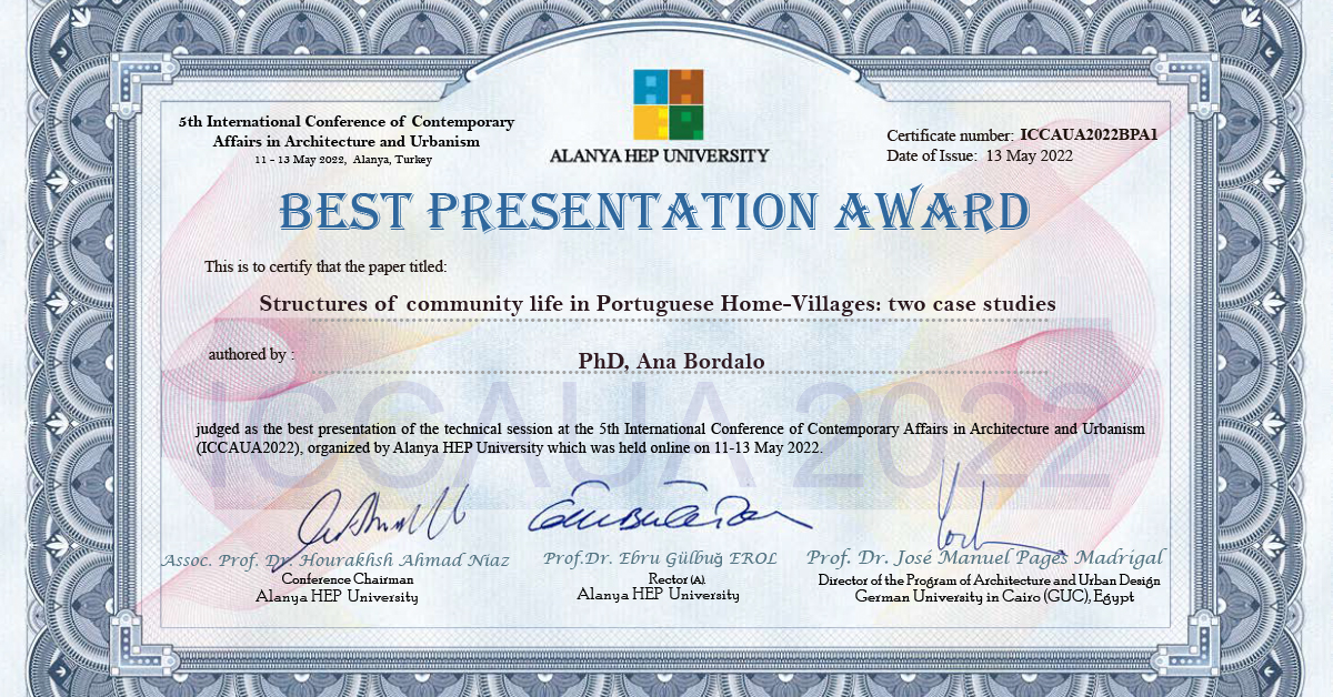 A Diretora do Mestrado Integrado em Arquitetura do ISMAT, Ana Bordalo, foi distinguida com o prémio para melhor apresentação, com o trabalho “Structures of community life in Portuguese Home-Villages: two case studie”, na 5th International Conference of Contemporary Affairs in Architecture and Urbanism, que se realizou entre os dias 11 a 13 de maio, com a organização da Alanya HEP University. Esta apresentação surgiu como seguimento do trabalho de investigação realizado pela Professora durante o seu Doutoramento e com a linha de investigação que vem sendo desenvolvida pelo MIA.ISMAT “Cidade de Acolhimento”.