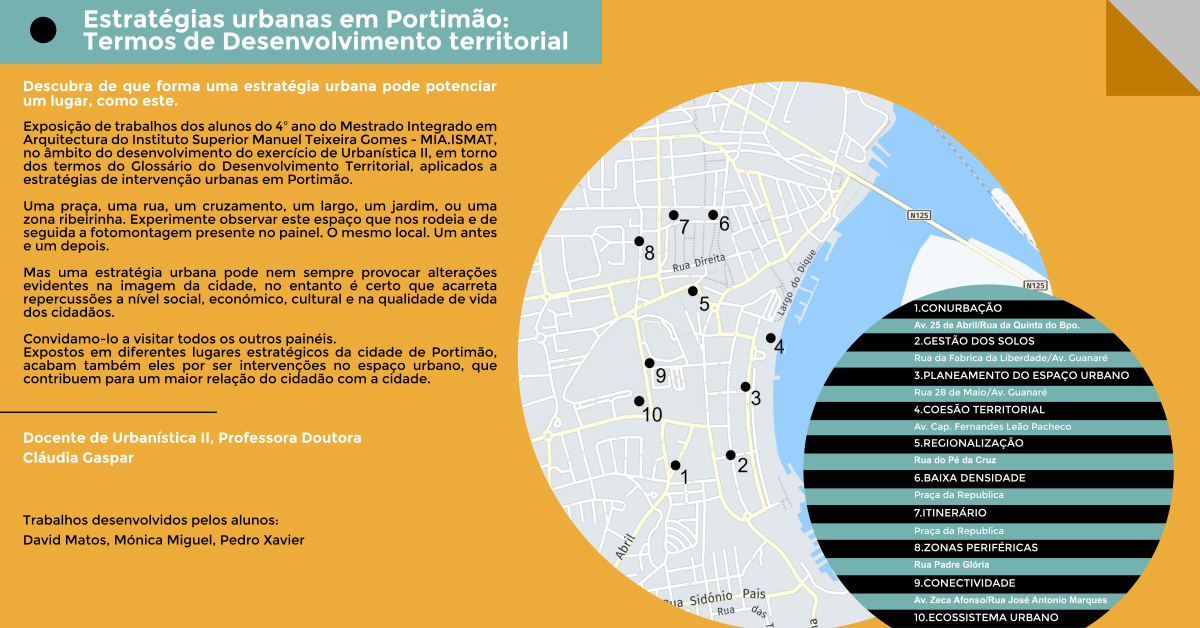 O MIA.ISMAT convida para a inauguração da exposição ESTRATÉGIAS URBANAS EM PORTIMÃO: TERMOS DE DESENVOLVIMENTO TERRITORIAL, no dia 2 de junho, às 17h30, na Praça da República [Alameda de Portimão]. Esta exposição apresenta o trabalho dos estudantes do 4.º ano do MIA.ISMAT, realizado no âmbito da Unidade Curricular de Urbanística, no ano letivo 2020-2021, com a coordenação da Professora Doutora Cláudia Gaspar.