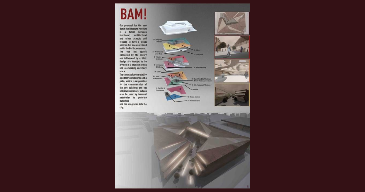 Um grupo de alunos do 1.º, 2.º e 5.º ano do Mestrado Integrado em Arquitetura do ISMAT - Instituto Superior Manuel Teixeira Gomes participou no concurso internacional para o projeto do Museu de Arquitetura de Berlim (BAM!), promovido pela ARCHmedium.