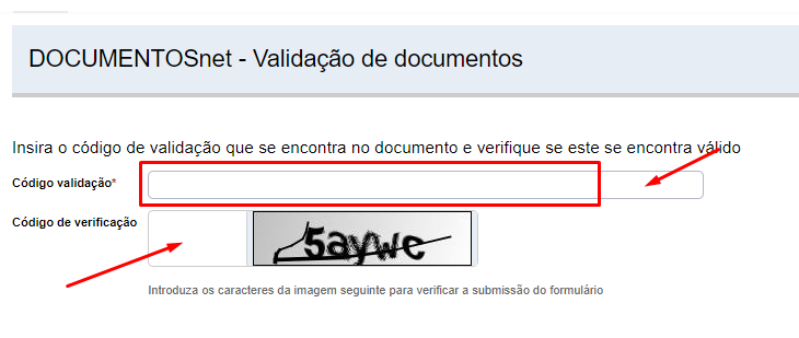 Para validar um documento basta colocar o código de validação que se encontra no documento. Deverá também colocar o código de verificação que é disponibilizado. Depois basta escolher a opção validar.
